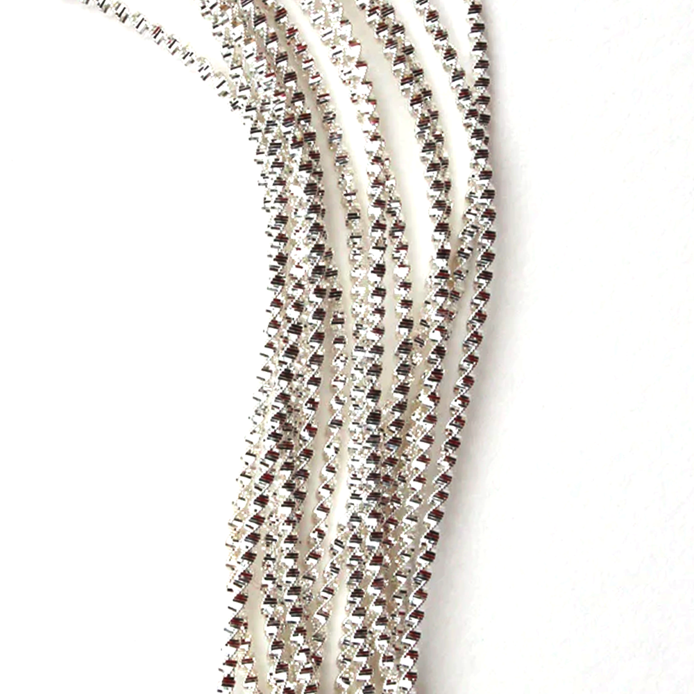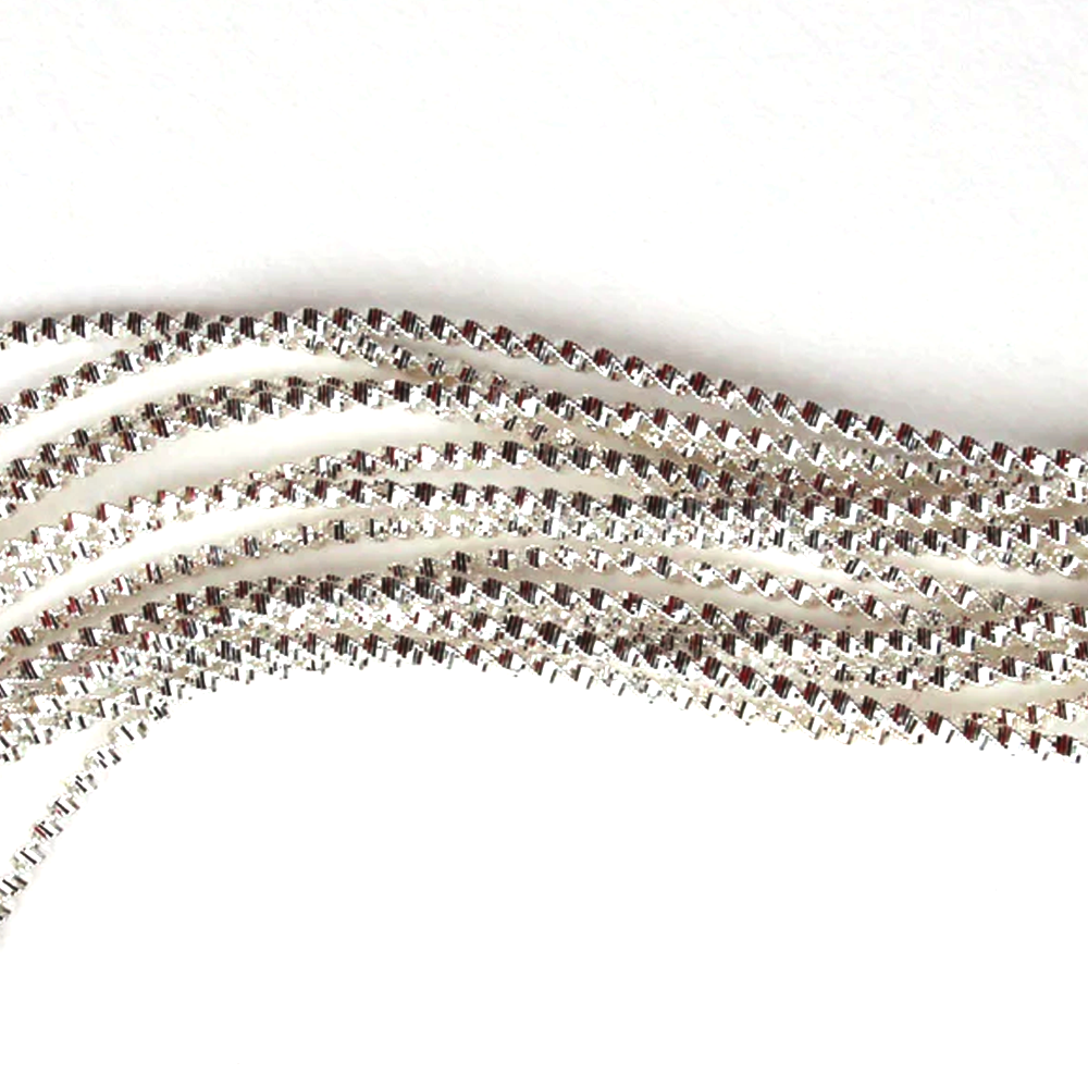 Bright Check is a Silver work wire which is made of a triangular shaped coil of fine wire - there is a hole through the center. The triangular shape acts like the facets on a gemstone to reflect light in different directions, making it sparkle. The wire is slightly flattened to give a very shiny surface. This thread is delicate until it is stitched down. Use Bright Check by stitching through the hollow center, like you would apply a bead. Use doubled thread with a good coat of beeswax.
