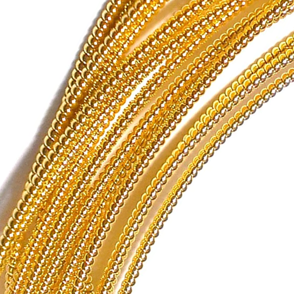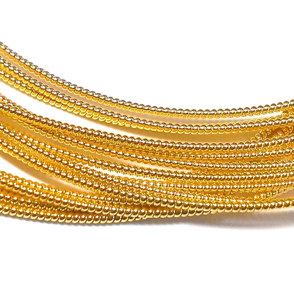 Pearl Purl is a goldwork wire with the appearance of a row of tiny metal pearls. It is made of a coil of wire so there is a hole through the centre. It is very strong and easy to manipulate while stitching and adds texture to your embroidery.