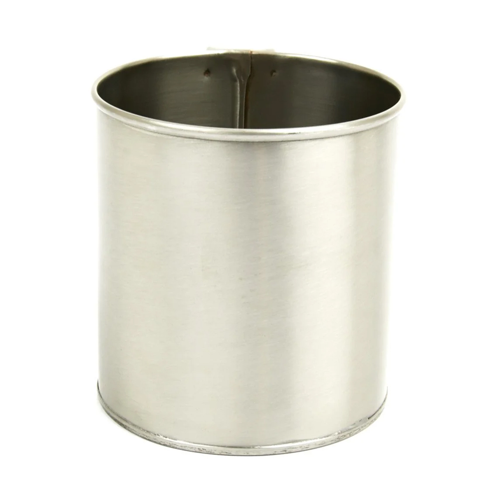 New Made Item: High quality brush finished stainless steel tin cups, 32 ounce, with rolled edges. Overall height is 4.5", diameter is 4". The finish becomes dull gray with daily use. These saw constant use from before the Revolutionary War through the Civil War.