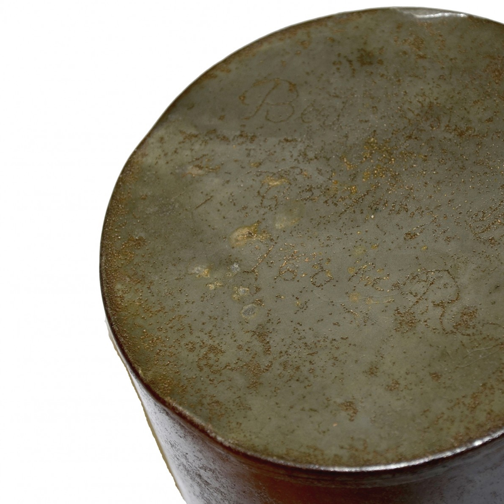 This cup resembles the so called Army issue cup in height and width. The cup meas. approx. 4.25 inches tall x 4.25 inches across the bottom. About a third of the way down from the top rim there is a raised line running around the body of the cup. The handle is attached to the side by two rivets and solder at the top and a single rivet and solder at the bottom. The surface of the cup has a nice dark patina. There are no holes anywhere on the body or base. Stamped into the side of the cup just below the rim is a very small number “6” above a number “36.” This may mean the cup belonged to soldier #36 in the 6th Company which would be Company F but this is only conjecture.
