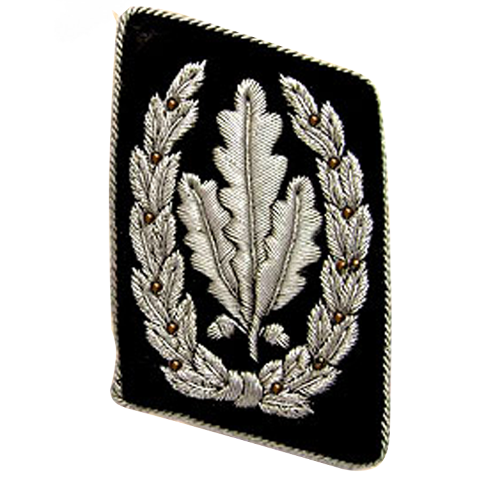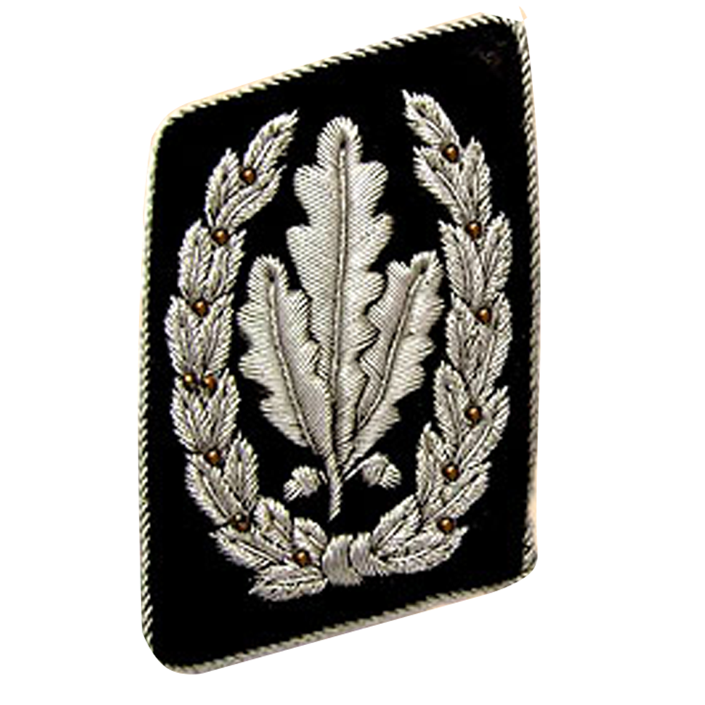 Extremely rare and seldom seen textbook collar tabs. Executed in silver embroidered bullion thread on black backing in felt. A Gold tresse is applied around both tabs. One of the tabs still holds the genuine manufacturer label. A stunning set, textbook and 100% original.